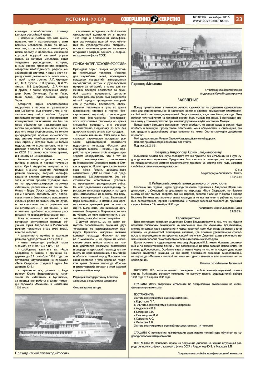 Сообщаю, что студент I курса судоводительского отделения т. Андропов Юрий Владимирович, работающий штурвальным на пароходе «Яков Свердлов», по Вашему вызову не мог явиться вовремя, так как пароход работал в аренде Унжлеса в городе Горьком. Не имея достаточного штата команды, я не мог выполнять работы по спасению лесоматериала (приказ Наркомвода) и поэтому задержал такового до прибытия судна в Рыбинск 25 сентября 1953 года.