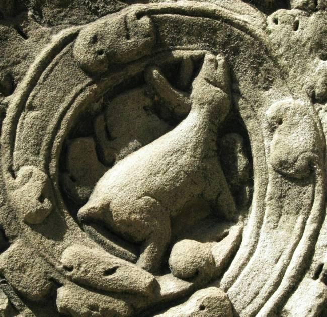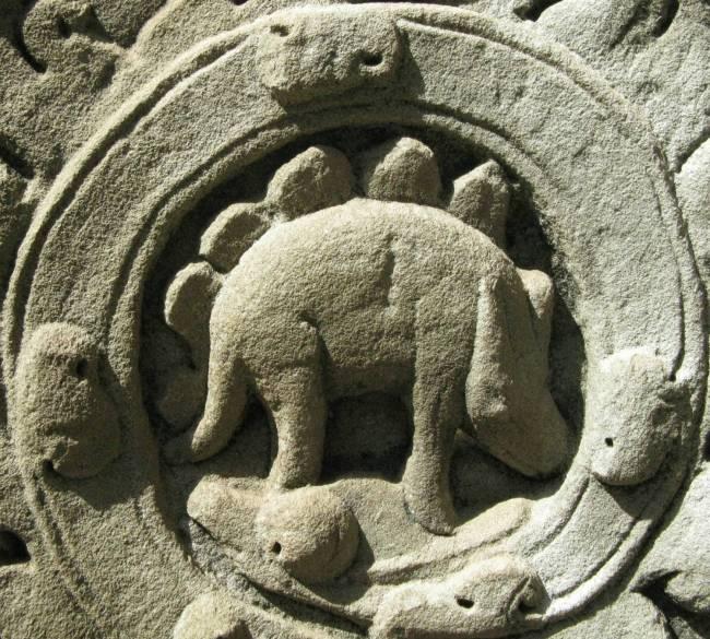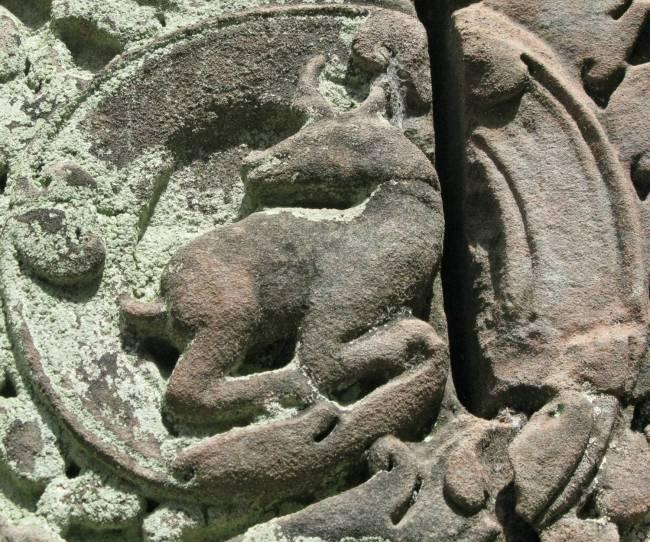 Животное на барельефе храма Та Пром храмового комплекса Ангкор (Камбоджа), находящееся над "стегозавром", напоминающее гиракодонтов, живших в эоцене и олигоцене (ранее 24-20 млн. лет назад).