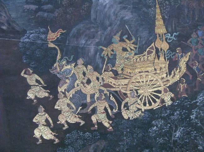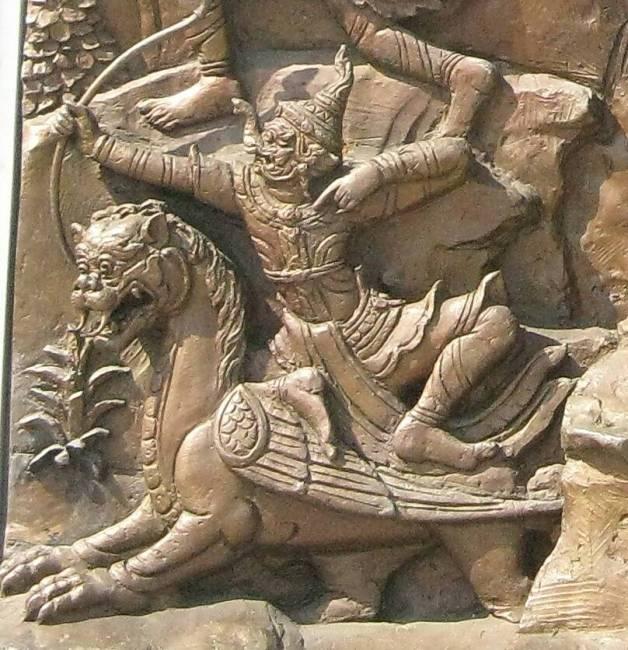 Предводитель ракшасов Равана на колеснице, запряженной драконами. Королевский дворец, Бангкок.