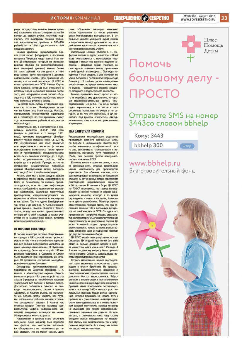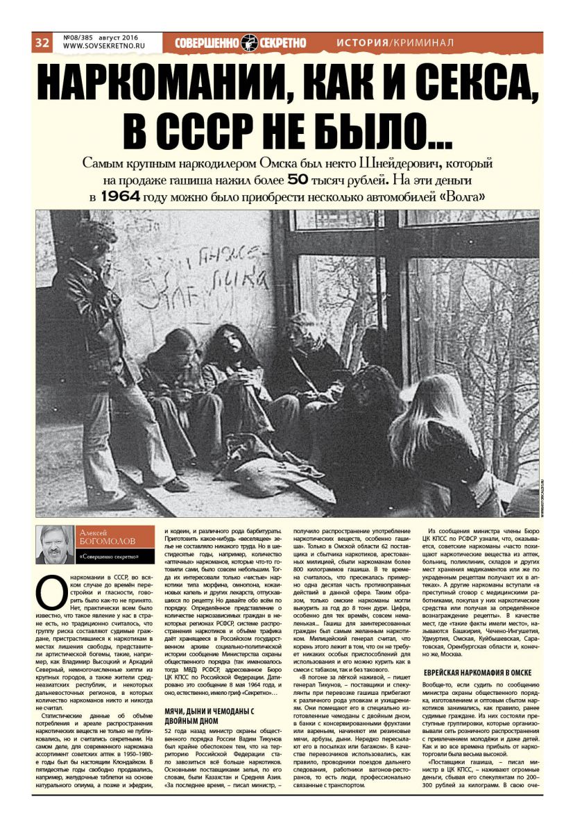 Самым крупным наркодилером Омска (этот город фигурирует в послании генерала Тикунова чаще всего) был некто Шнейдерович, который на продаже гашиша (только по запротоколированным милицией данным) нажил более 50 тысяч рублей. На эти деньги в 1964 году можно было приобрести с десяток автомобилей «Волга». Для сравнения отметим, что первый секретарь ЦК КПСС и глава правительства СССР Никита Сергеевич Хрущёв, который был отправлен в отставку через несколько месяцев после того, как цитируемое нами письмо обсуждалось в ЦК, получал заработную плату чуть более 600 рублей в месяц…