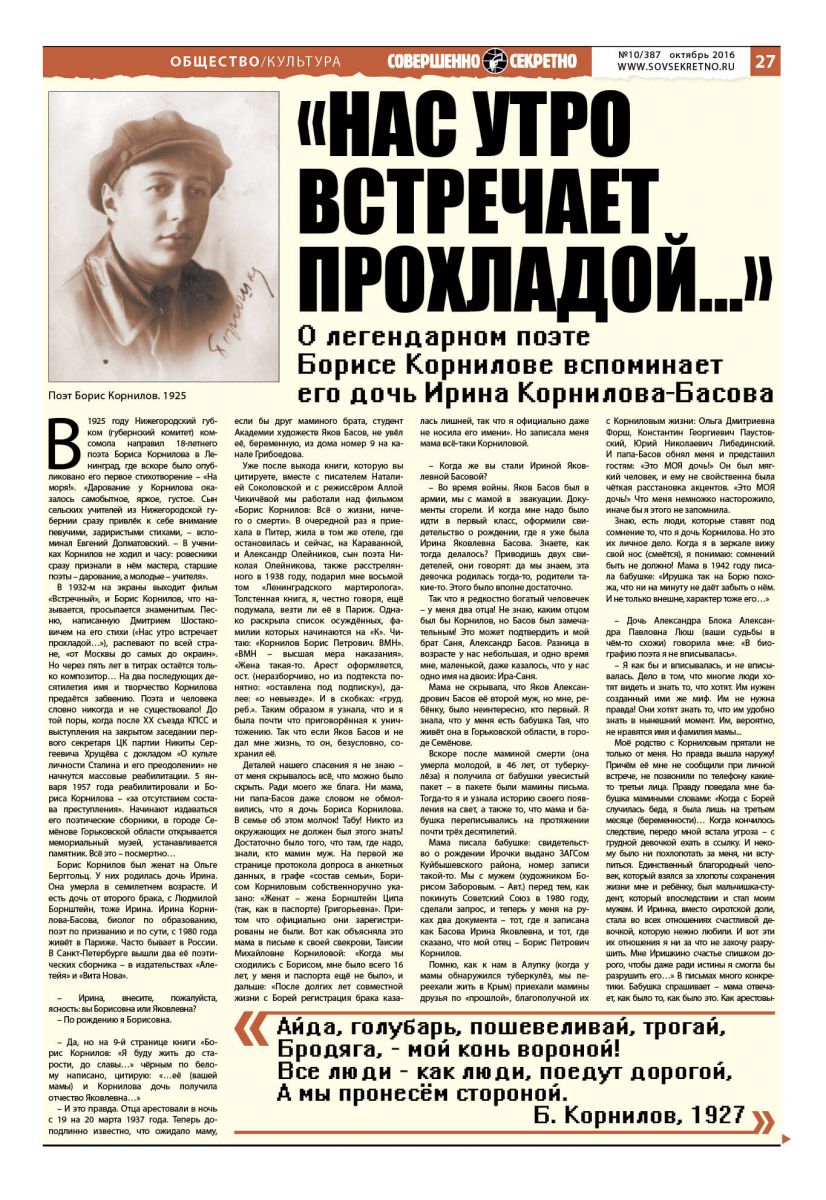 Уже после выхода книги, которую вы цитируете, вместе с писателем Наталией Соколовской и с режиссёром Аллой Чикичёвой мы работали над фильмом «Борис Корнилов: Всё о жизни, ничего о смерти». В очередной раз я приехала в Питер, жила в том же отеле, где остановилась и сейчас, на Караванной, и Александр Олейников, сын поэта Николая Олейникова, также расстрелянного в 1938 году, подарил мне восьмой том «Ленинградского мартиролога». Толстенная книга, я, честно говоря, ещё подумала, везти ли её в Париж. Однако раскрыла список осуждённых, фамилии которых начинаются на «К». Читаю: «Корнилов Борис Петрович. ВМН». «ВМН – высшая мера наказания». «Жена такая-то. Арест оформляется, ост. (неразборчиво, но из подтекста понятно: «оставлена под подписку»), далее: «о невыезде». И в скобках: «груд. реб.». Таким образом я узнала, что и я была почти что приговорённая к уничтожению. Так что если Яков Басов и не дал мне жизнь, то он, безусловно, сохранил её.
