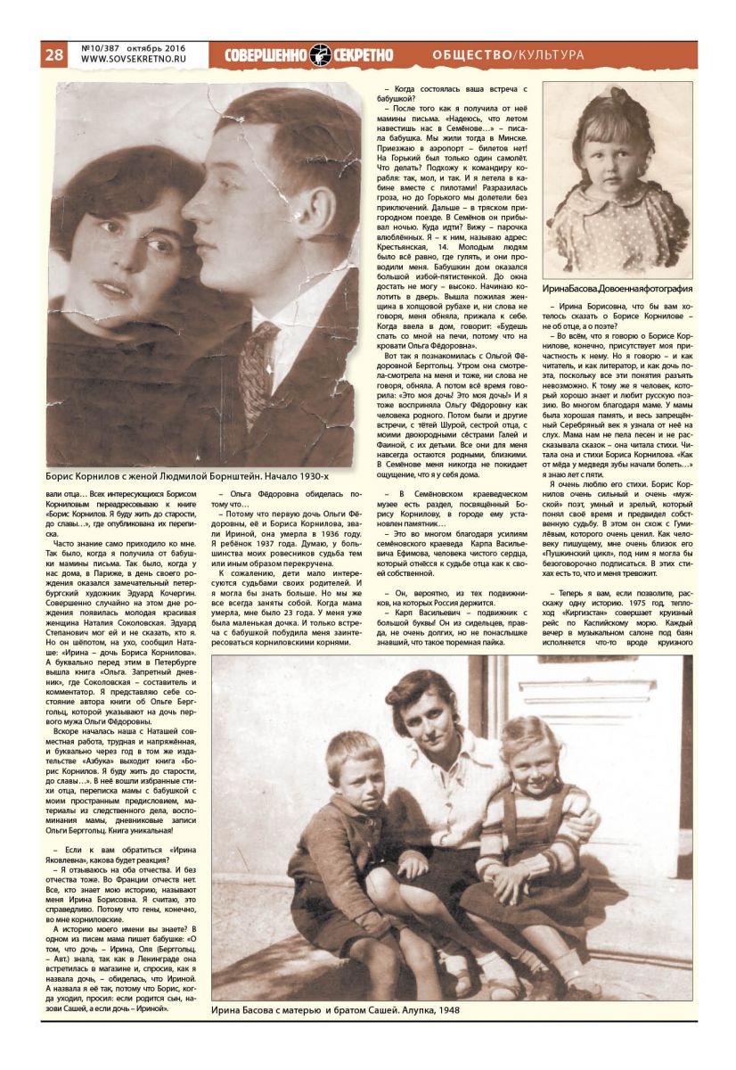 Моё родство с Корниловым прятали не только от меня. Но правда вышла наружу! Причём её мне не сообщили при личной встрече, не позвонили по телефону какие-то третьи лица. Правду поведала мне бабушка мамиными словами: «Когда с Борей случилась беда, я была лишь на третьем месяце (беременности)… Когда кончилось следствие, передо мной встала угроза – с грудной девочкой ехать в ссылку. И некому было ни похлопотать за меня, ни вступиться. Единственный благородный человек, который взялся за хлопоты сохранения жизни мне и ребёнку, был мальчишка-студент, который впоследствии и стал моим мужем. И Иринка, вместо сиротской доли, стала во всех отношениях счастливой девочкой, которую нежно любили. И вот эти их отношения я ни за что не захочу разрушить. Мне Иришкино счастье слишком дорого, чтобы даже ради истины я смогла бы разрушить его…» В письмах много конкретики. Бабушка спрашивает – мама отвечает, как было то, как было это. Как арестовывали отца… Всех интересующихся Борисом Корниловым переадресовываю к книге «Борис Корнилов. Я буду жить до старости, до славы…», где опубликована их переписка.