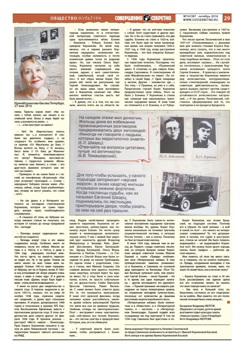 Вскоре началась наша с Наташей совместная работа, трудная и напряжённая, и буквально через год в том же издательстве «Азбука» выходит книга «Борис Корнилов. Я буду жить до старости, до славы…». В неё вошли избранные стихи отца, переписка мамы с бабушкой с моим пространным предисловием, материалы из следственного дела, воспоминания мамы, дневниковые записи Ольги Берггольц. Книга уникальная!
