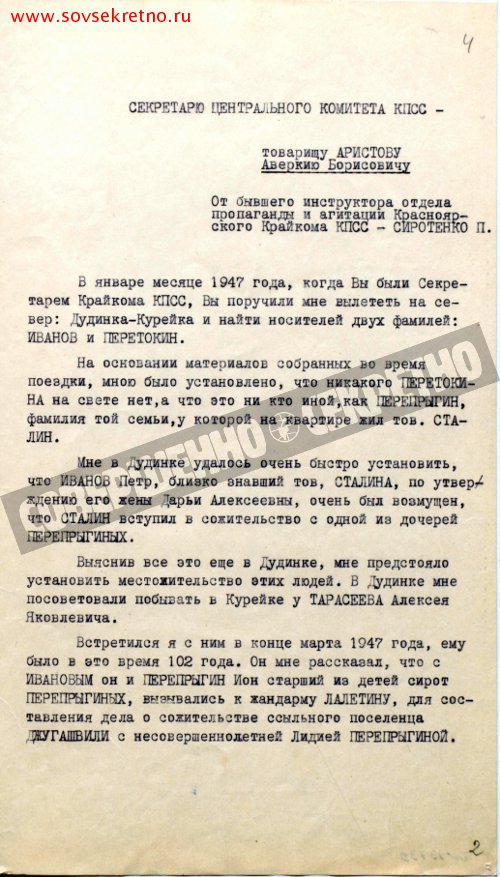Вообще-то уже первый абзац этого текста разбивает все тезисы исследователей и журналистов относительно того, что Сталин не интересовался семейством Перепрыгиных. Вот что написал Хрущёву Аверкий Аристов: «В бытность мою секретарём Красноярского крайкома КПСС (с июля 1944 по февраль 1950 года. – Авт.) в один из приездов в Москву в конце 1946 года мне позвонил тов. Поскрёбышев (секретарь Сталина. – Авт.) и спросил меня, что я знаю об Ивановых и Перепрыгиных, проживающих в Курейке, где был в ссылке тов. Сталин. Я ему ответил, что ничего не знаю об Ивановых и Перепрыгиных. Тов. Поскрёбышев попросил меня навести справки об этих людях по возвращении в Красноярск, так как ими интересуется тов. Сталин».