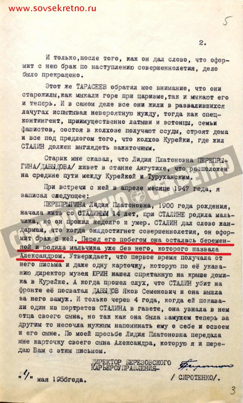 Напомним читателям, что цитируемый и растиражированный доклад, выполненный не на личном бланке председателя КГБ, а на обычном бланке КГБ СССР, датируется 4 июня 1956 года. И в нём есть ссылка на то, что в мае 1956 года «гражданку Перелыгину» допрашивали относительно обстоятельств её знакомства со Сталиным и рождения детей. И вот тут начинается самое интересное. В июньском письме на имя Хрущёва много путаницы. Например, сожительница Сталина Лидия Перепрыгина из Курейки именуется Перелыгиной, год рождения сына Александра указан не 1917-й, а 1914-й. А ещё при этом Серов ссылается на то, что «Перелыгина» рассказала о деталях отношений с будущим «вождём народов» и о том, что у неё в 1913 году родился сын, который умер. Отметим в скобках, что Сталин прибыл в Курейку не в 1913 году, а в марте 1914-го…
