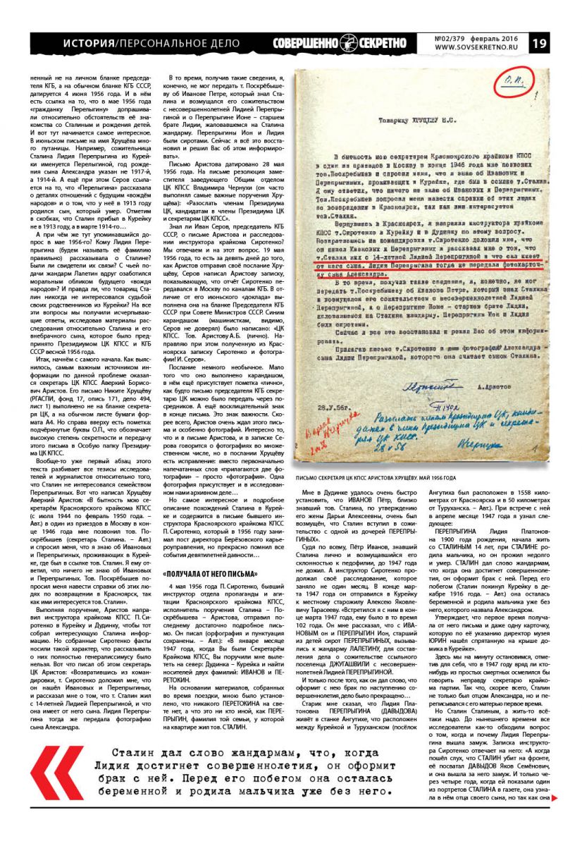 Выполняя поручение, Аристов направил инструктора крайкома КПСС П. Сиротенко в Курейку и Дудинку, чтобы тот собрал интересующую Сталина информацию. Но собранные Сиротенко факты носили такой характер, что рассказывать о них полностью генералиссимусу было нельзя. Вот что писал об этом секретарь ЦК Аристов: «Возвратившись из командировки, т. Сиротенко доложил мне, что он нашёл Ивановых и Перепрыгиных, и рассказал мне о том, что т. Сталин жил с 14-летней Лидией Перепрыгиной, и что она имеет от него сына. Лидия Перепрыгина тогда же передала фотографию сына Александра.
