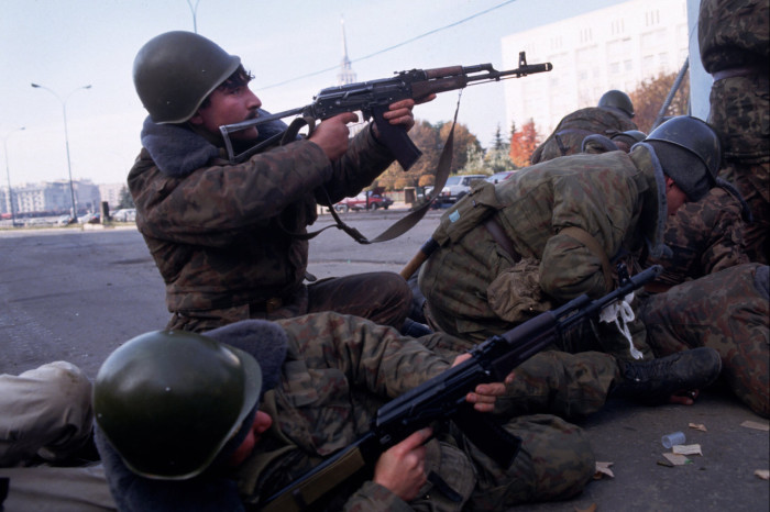 Солдаты, прячущиеся за бетонные блоки во время штурма Белого Дома. Россия, Москва, 1993 год.