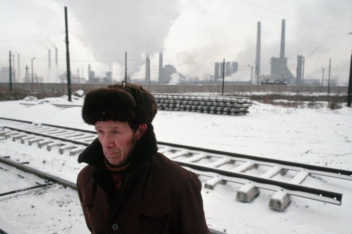 Мужчина, идущий в районе Челябинского металлургического комбината. Россия, Челябинск, 1991 год.