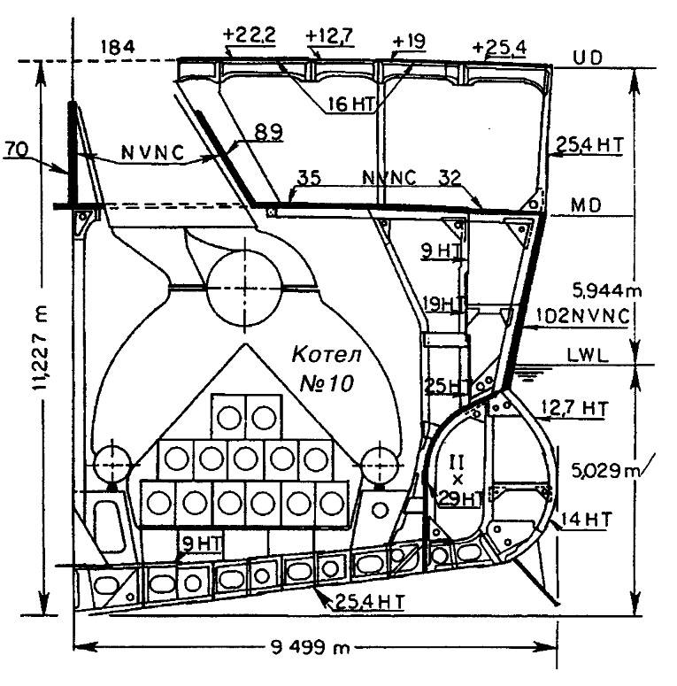 Броневые плиты, формирующие бронепояс и главную бронепалубу, входили в состав силового набора, увеличивая его продольную прочность.