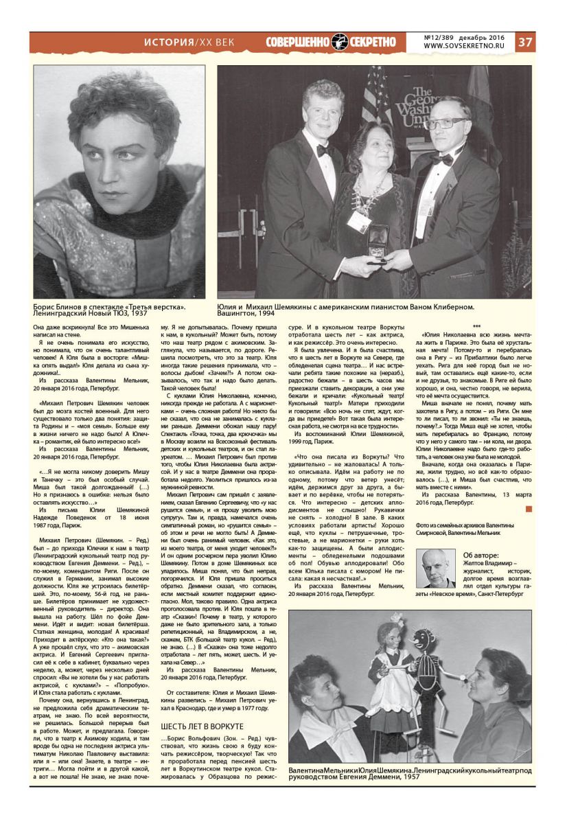 В основе данного повествования – письма Юлии Николаевны Шемякиной своей сводной сестре Валентине Смирновой, писательнице Надежде Поведенок (переписка завязалась, когда Надежда Георгиевна собирала материал для повести о Борисе Блинове, опубликованной под названием «Жил-был артист»), письма подруге актрисе Валентине Мельник, а также воспоминания близких Юлии Николаевне людей, записанные автором данной публикации, журналистом Владимиром Желтовым.
