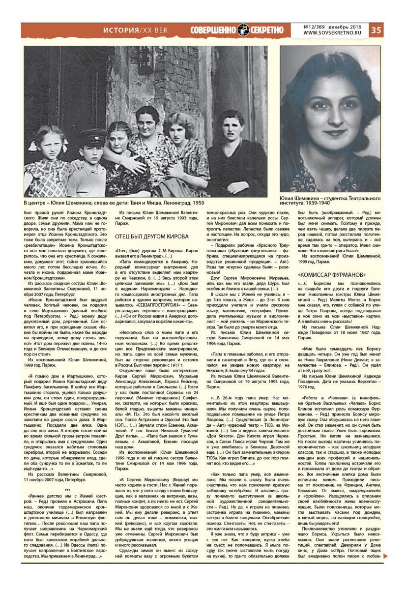 Из рассказа сводной сестры Юлии Шемякиной Валентины Смирновой, 11 ноября 2007 года, Петербург.