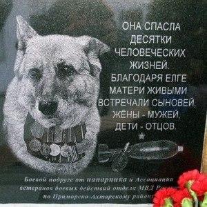 Во время очередной командировки в Чечню в марте 2012 г. Елга подорвалась на мине, жизнь многих военнослужащих была спасена. Овчарка тогда выжила, но серьезное ранение подорвало ее здоровье и она умерла на руках своего хозяина, который поставил ей памятник!