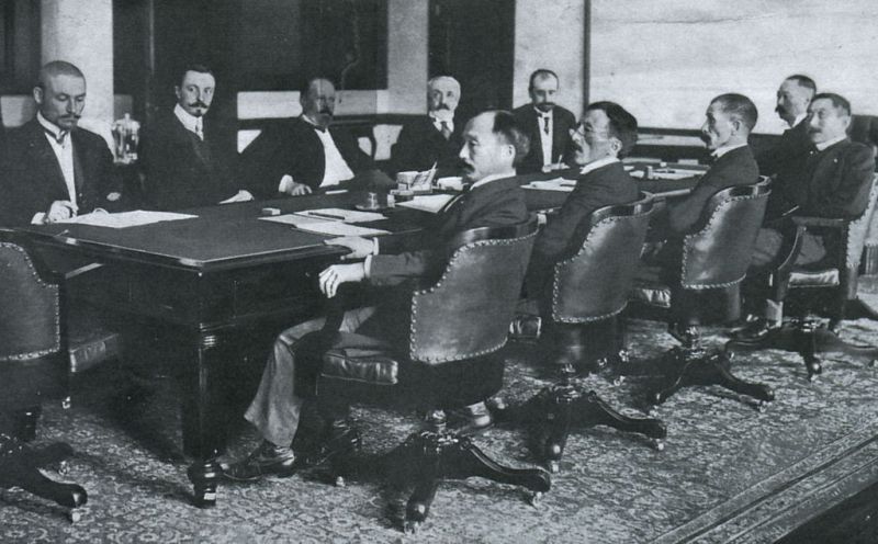 Переговоры в Портсмуте. Слева направо: с русской стороны — Г. А. Плансон, К. Д. Набоков, С. Ю. Витте, Р. Р. Розен, И. Я. Коростовец; с японской стороны — Адати, Комура, Такахира, Сато