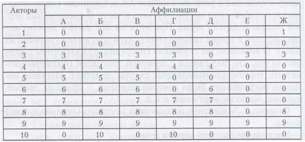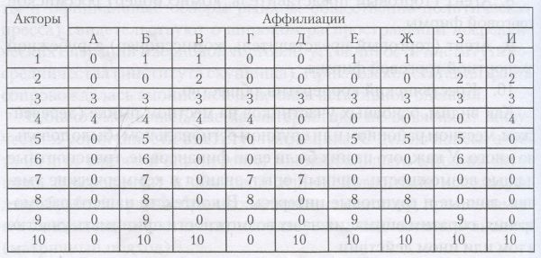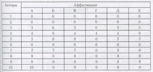 Теперь построим матрицу возможности действий каждого участника (актора) в той или иной процедуре (аффилиации). Если актор участвовал в той или иной процедуре, мы ставим советующий ему номер в столбце аффилиаций. Если он не мог принимать участия, ставим 0.