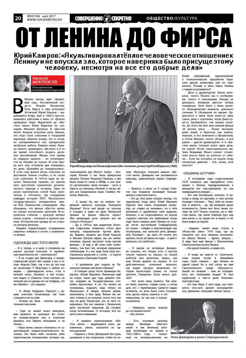 В Малом театре идёт «Вишнёвый сад», поставленный когда-то Игорем Ильинским. Роль Фирса в нём исполняет 90-летний Юрий Каюров – выдающийся актёр, ещё в 1960-е прославившийся работами в кино, от «Долгих проводов» Киры Муратовой до «Шестого июля» Юлия Карасика по сценарию Михаила Шатрова. В «Шестом июля» Каюров исполнил роль Ленина, его игра стала событием в тогдашней веренице образов вождя, это и сегодня воспринимается как грандиозная актёрская работа. Каюров играл Ленина умного, думающего, жёсткого и в то же время способного воздать должное противникам. Фильм стал одним из лидеров проката – по популярности он обошёл не только «В огне брода нет» или «Служили два товарища», но даже «Доживём до понедельника». В этом году фильм вновь показали на фестивале «Белые столбы», и он снова стал событием. В 1970-м едва не получил Ленинскую премию, но против него выступили охранители догматического подхода к истории. Одна из резко критических статей была напечатана в «Огоньке», где сотрудники кафедры истории КПСС Московского государственного университета имени М.В. Ломоносова утверждали: «Мы убеждены, что фильм «Шестое июля» не служит воспитанию зрителей. Историческое событие – разгром мятежа левых эсеров – показано в кривом зеркале. Историческая правда не на стороне авторов фильма».