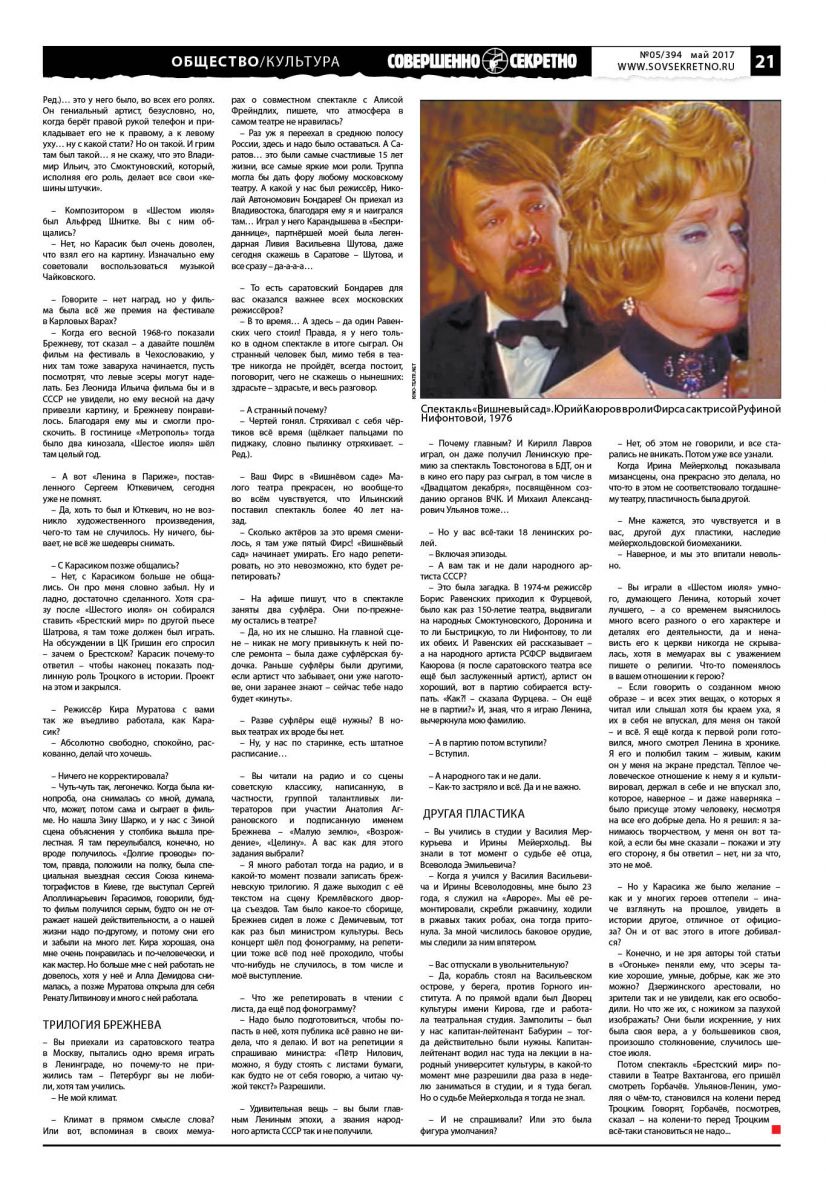 – И когда вы вместе со Смоктуновским играли позже в «Вишнёвом саде», было смешно – два Ленина на одной сцене! Но в той статье вы имя Смоктуновского среди образцов-событий не назвали – вам не понравилось его толкование вождя? То был нервозный, в чём-то даже болезненный персонаж.