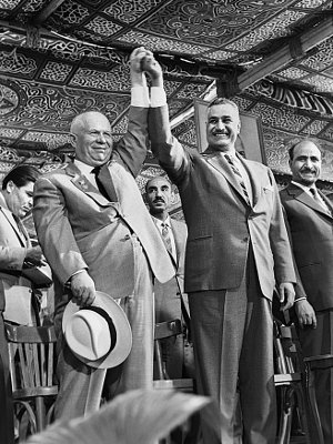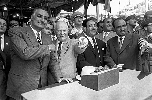 Торжественная церемония перекрытия русла Нила. На пульт с кнопкой, передавшей команду на подрыв перемычки обводного канала, одновременно нажали Насер, Хрущёв, тогдашний лидер баасистского режима в Ираке Абдель Салям Ареф, президент Северного Йемена Абдалла ас-Салляль и глава Временного правительства Алжирской Республики Ахмед Бен Белла (не вошёл в кадр). За спинами Насера и Хрущёва – переводчик А. И. Чернышов. 13 мая 1964