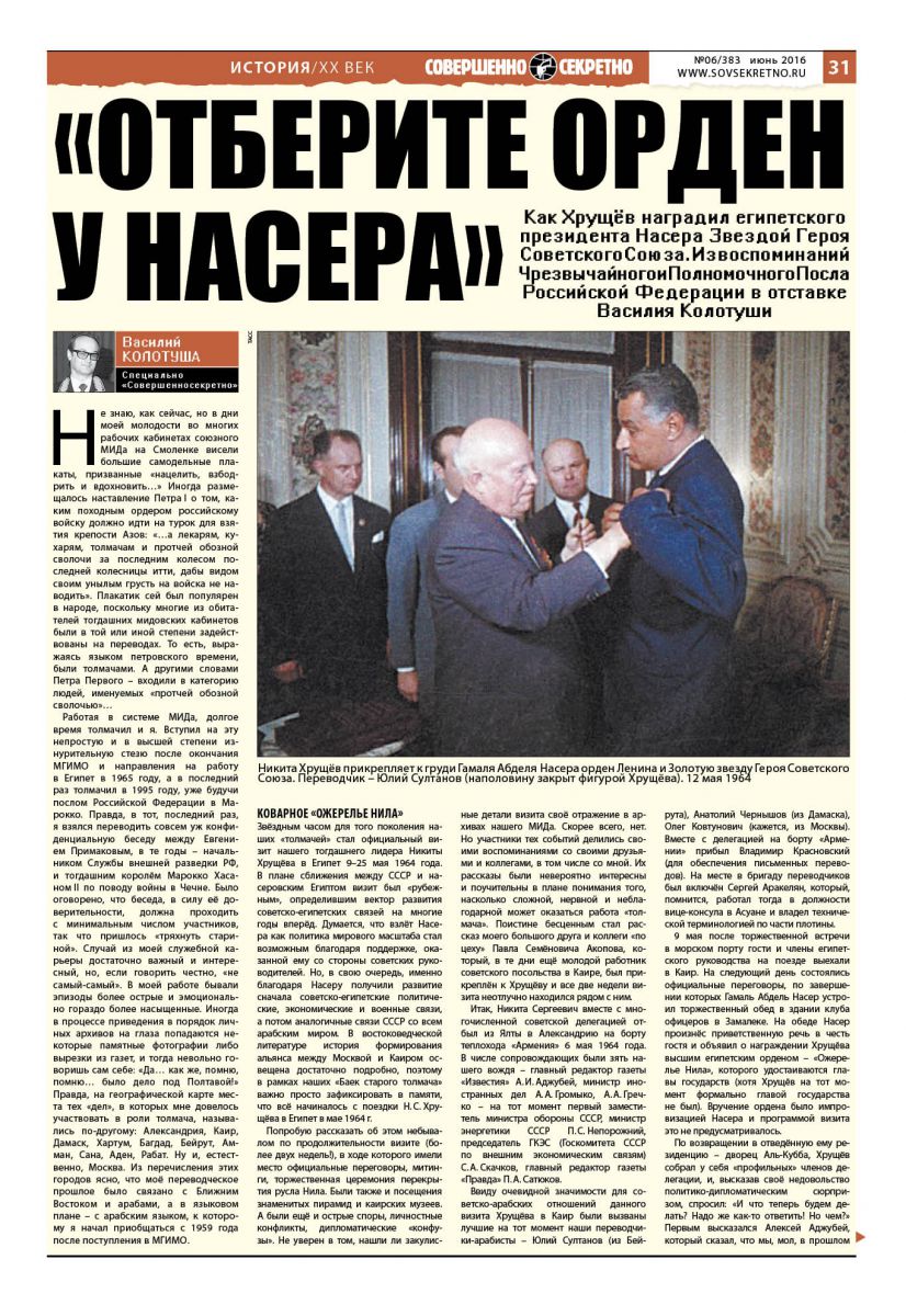 Как Хрущёв наградил египетского президента Насера Звездой Героя Советского Союза. Из воспоминаний Чрезвычайного и Полномочного Посла Российской Федерации в отставке Василия Колотуши