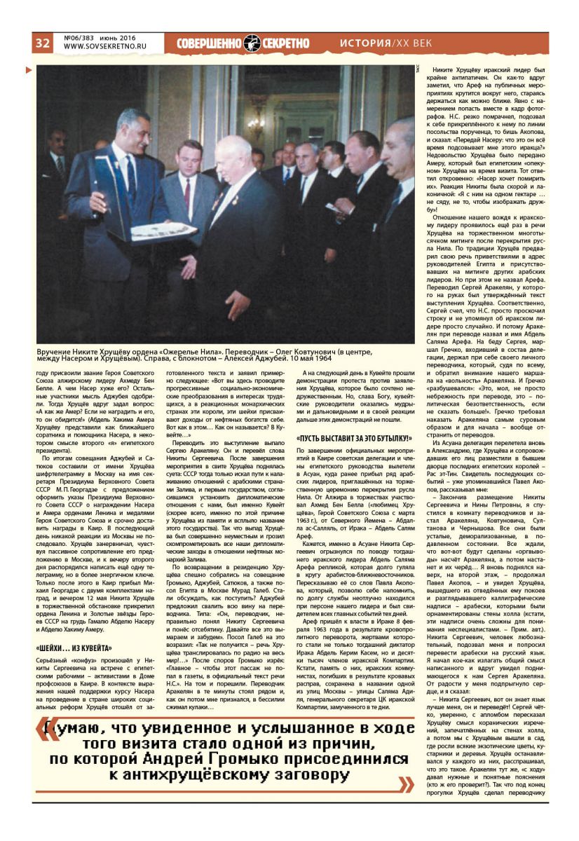 Отношение нашего вождя к иракскому лидеру проявилось ещё раз в речи Хрущёва на торжественном многотысячном митинге после перекрытия русла Нила. По традиции Хрущёв предварил свою речь приветствиями в адрес руководителей Египта и присутствовавших на митинге других арабских лидеров. Но при этом не назвал Арефа. Переводил Сергей Аракелян, у которого на руках был утверждённый текст выступления Хрущёва. Соответственно, Сергей счел, что Н.С. просто проскочил строку и не упомянул об иракском лидере просто случайно. И потому Аракелян при переводе назвал и имя Абдель Саляма Арефа. На беду Сергея, маршал Гречко, входивший в состав делегации, держал при себе своего личного переводчика, который, судя по всему, и обратил внимание нашего маршала на «вольность» Аракеляна. И Гречко «разбушевался»: «Это, мол, не просто небрежность при переводе, это – политическая безответственность, если не сказать больше!». Гречко требовал наказать Аракеляна самым суровым образом и для начала – вообще отстранить от переводов.
