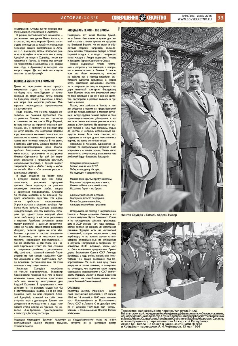 Звёздным часом для того поколения наших «толмачей» стал официальный визит нашего тогдашнего лидера Никиты Хрущёва в Египет 9–25 мая 1964 года. В плане сближения между СССР и насеровским Египтом визит был «рубежным», определившим вектор развития советско-египетских связей на многие годы вперёд. Думается, что взлёт Насера как политика мирового масштаба стал возможным благодаря поддержке, оказанной ему со стороны советских руководителей. Но, в свою очередь, именно благодаря Насеру получили развитие сначала советско-египетские политические, экономические и военные связи, а потом аналогичные связи СССР со всем арабским миром. В востоковедческой литературе история формирования альянса между Москвой и Каиром освещена достаточно подробно, поэтому в рамках наших «Баек старого толмача» важно просто зафиксировать в памяти, что всё начиналось с поездки Н. С. Хрущёва в Египет в мае 1964 г.