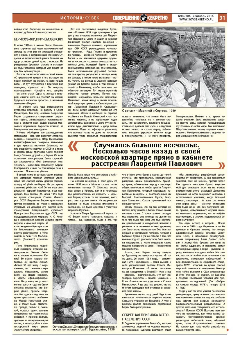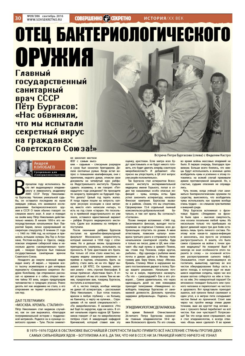 …В апреле 1950 года эпидемиолога Бургасова перевели на работу в Совет Министров. Там под началом Лаврентия Берии создавалась специальная секретная группа, занимавшаяся исследованиями в области всех видов оружия массового поражения. Бургасов отвечал за бактериологическое оружие.