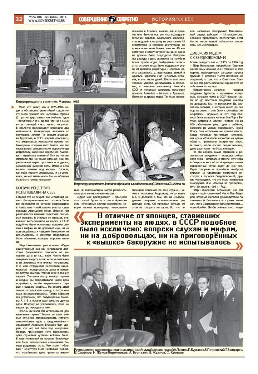 Мало кто знает, что в 1975–1976 годах в обстановке высочайшей секретности было привито все население страны (!) против двух самых сильнейших ядов – ботулизма А и Б, да так, что ни в СССР, ни за границей никто ничего не узнал. В обычную поливакцину включили два компонента, защищающих человека от ботулизма. Зачем? По словам академика Бургасова, в СССР всерьёз опасались, что американцы используют против нас бакоружие. «Почему нет? Знаете, как так называемые американские переселенцы истребляли коренное население Америки – индейские племена? Они не только спаивали его, но самое главное, они его уничтожали через простыни и подушки, заражённые вирусом оспы. Именно оспа косила племена под корень… Словом, как себя поведут американцы и их союзники, не мог знать никто. Но мы обязаны были быть готовы ко всему!»