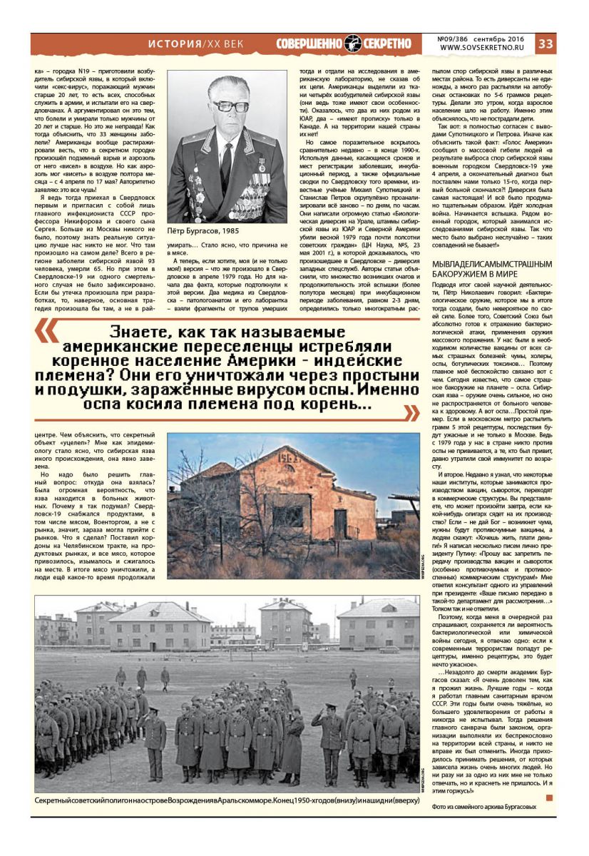 «Вдруг мне докладывают, – описывал этот случай Бургасов, – что в Аральске есть непонятные случаи смертности. Говорю своему помощнику: немедленно поезжай в Аральск, выясни всё и доложи мне. Выяснилось вот что: исследовательский корабль Аральского мореходства подошёл к острову на расстояние 15 километров (а согласно инструкции, во время испытаний ближе, чем на 40 километров к этому острову ни одно судно не должно было подходить). Лаборантка дважды в день выходила на палубу и брала пробы воды. Возбудитель оспы – а на острове тогда было подорвано всего 20 граммов рецептуры – «достал» её, она заразилась, а, вернувшись домой в Аральск, заразила ещё несколько человек, в том числе детей. Шесть или семь человек умерли. Догадавшись о причинах, я позвонил начальнику Генштаба СССР и попросил запретить остановку поездов Алма-Ата – Москва в Аральске. Приняли и другие меры. Так была предотвращена эпидемия по всей стране… Потом я позвонил Андропову, тогда главе КГБ, и доложил о том, что на «Возрождении» получена исключительная рецептура оспы. Он приказал больше об этом не говорить ни слова. Вот что такое настоящее бакоружие! Минимальный радиус действия – 15 километров. Страшно представить последствия, если бы на месте одной лаборантки оказалось 100–200 человек».