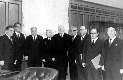 Руководители здравоохранения и медицинской науки (слева направо): А. Павлов, П. Бургасов, Б. Петровский, Т. Болдырев, Е. Смирнов, Н. Жуков-Вережников, А. Бурназян, В. Жданов, Ф. Кротков