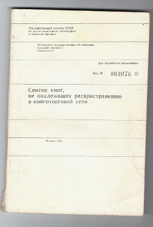 Передо мной лежит замечательная книга со скучным названием «Список книг, не подлежащих распространению в книготорговой сети». Это изданный в 1981 году библиографический указатель книг, которые в разное время начиная с 1949 года приказами Главлита изымались из магазинов. Естественно, на обложке есть гриф «Для служебного пользования» и номер конкретного экземпляра…