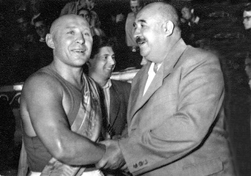 Известный советский боксёр Нур Алимов поздравляет молодого чемпиона Королёва