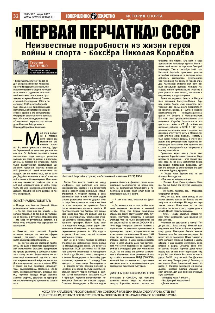 14 марта исполняется 100 лет со дня рождения Николая Королёва – одного из незаслуженно забытых героев советского спорта, который прославился подвигами не только на боксёрском ринге, но и в сражениях во время Великой Отечественной. С середины 1930-х и по середину 1950-х годов Королёв был, несомненно, одним из самых популярных спортсменов в нашей стране, однако в его официальной биографии остаётся много неясных мест. О своём легендарном отце «Совершенно секретно» рассказала дочь Николая Фёдоровича – Надежда Королёва-Башарова.