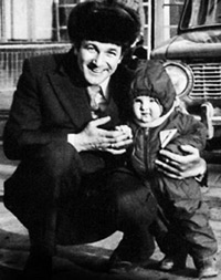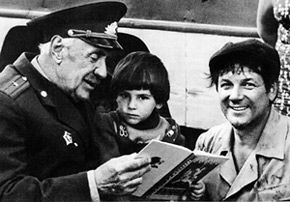 | С Михаилом Жаровым и приемным сыном Андрюшей на съемках филь ма «И снова Анискин», 1977 год. Через год после трагической гибели первого ребенка Александр Борисович с супругой Валентиной взяли мальчика из детдома. В 20 лет, при до сих пор невыясненных обстоятельствах, Андрей выпал из окна |