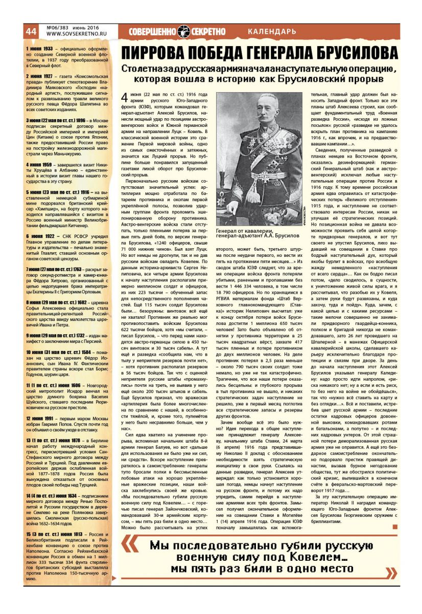 Сведения, полученные разведкой о планах немцев на Восточном фронте, оказались дезинформацией: германский Генеральный штаб (как и австро-венгерский) исключал любые наступательные операции против России в 1916 году. К тому времени российская армия едва оправилась от катастрофических потерь «Великого отступления» 1915 года, и наступление не соответствовало интересам России, никак не улучшая её стратегических позиций. Но позиционная война не давала возможности проявить себя целой когорте придворных генералов, и вот тут своего не упустил Брусилов, лихо выдавший на совещании в Ставке про бодрый наступательный дух, который якобы бурлит в войсках, про всеобщую жажду немедленного «наступления от всего сердца»… Как он бодро писал потом, «дело сводилось, в сущности, к уничтожению живой силы врага, и я рассчитывал, что разобью их у Ковеля, а затем руки будут развязаны, и куда захочу, туда и пойду». Куда, зачем, с какой целью и с какими ресурсами – такие мелочи совершенно не занимали придворного гвардейца-конника, полком и бригадой никогда не командовавшего, зато 26 лет проведшего на Шпалерной – в манежах Офицерской кавалерийской школы, сделавшего карьеру исключительно благодаря протекции и связям при дворе. За день до начала наступления этот Алексей Брусилов указывал генералу Каледину: надо просто идти напролом, «риска никакого нет; ну а если и есть риск, то без него на войне не обойдёшься», так что «нужно всё ставить на карту и без оглядки…». Всё и поставили, истребив цвет русской армии – последние остатки кадровых офицеров довоенной выковки, командовавших ротами и батальонами, а попутно – и последних кадровых унтеров. От этой страшной потери деморализованная русская армия уже не оправится. А ещё это бездарное самоистребление окончательно подорвало престиж правящей династии, вызвав бурное негодование общества, тут же обострился политический кризис, вылившийся в конечном счёте в февральско-мартовский переворот 1917 года…