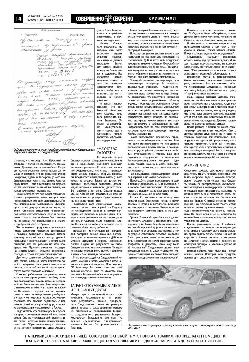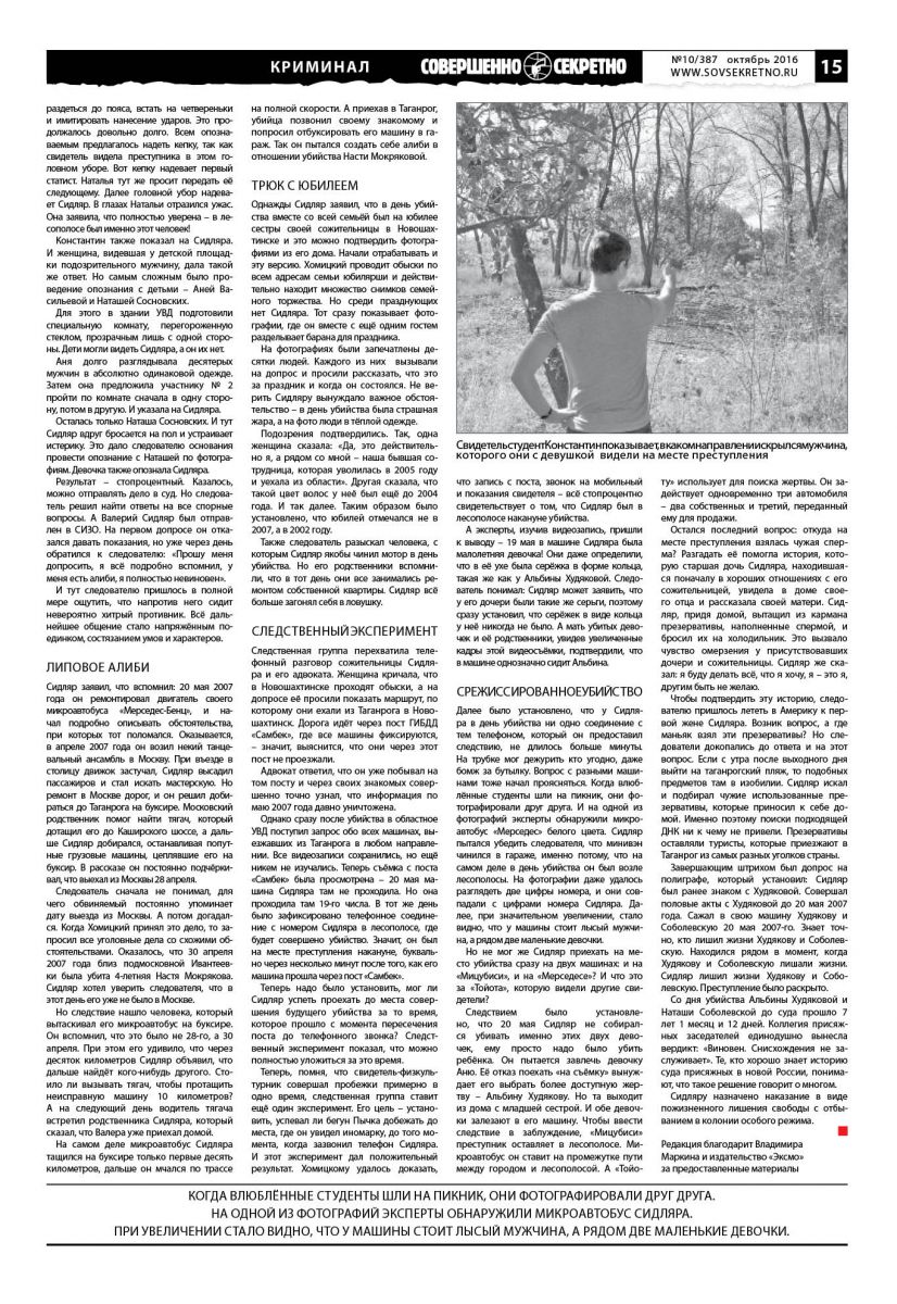 Следователь сначала не понимал, для чего обвиняемый постоянно упоминает дату выезда из Москвы. А потом догадался. Когда Хомицкий принял это дело, то запросил все уголовные дела со схожими обстоятельствами. Оказалось, что 30 апреля 2007 года близ подмосковной Ивантеевки была убита 4-летняя Настя Мокрякова. Сидляр хотел уверить следователя, что в этот день его уже не было в Москве.