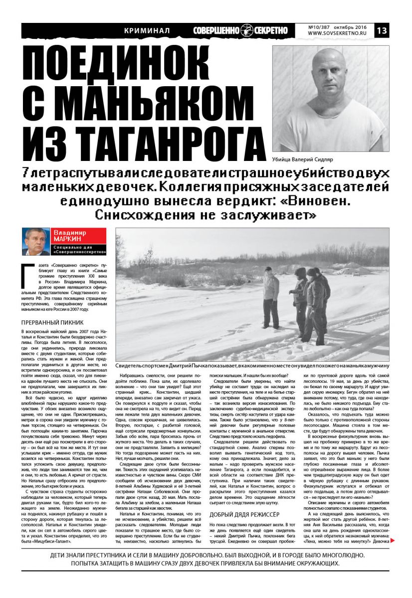 Газета Совершенно секретно публикует главу из книги Самые громкие преступления XXI века в России Владимира Маркина, долгое время являвшегося официальным представителем Следственного комитета РФ. Эта глава посвящена страшному преступлению, совершённому серийным маньяком на юге России в 2007 году.