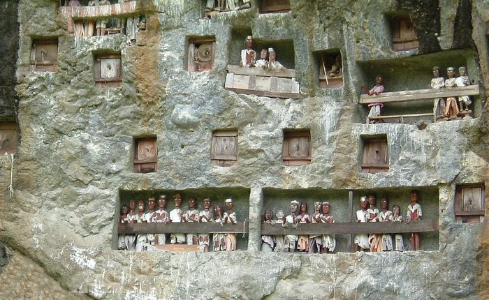 В индонезийском регионе Тораджаланд умерших людей в последний путь провожают весело и задорно, правда, через несколько лет после смерти. Вот только туристы порой пугаются, когда на рассвете замечают, как с балкончиков на скалах на них смотрят большие белые глаза…