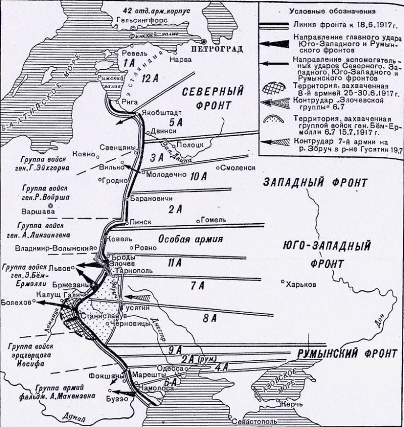 К 14 июля русские войска отошли на р. Збручь. Противника сдерживали лишь кавалерия и отдельные, еще не потерявшие боеспособность пехотные части – в то время как остальные обсуждали в комитетах и на митингах боевые приказы, а чаще всего отказывались их выполнять, устремляясь в тыл [Кавтарадзе А. Г. Июньское наступление. С. 116].