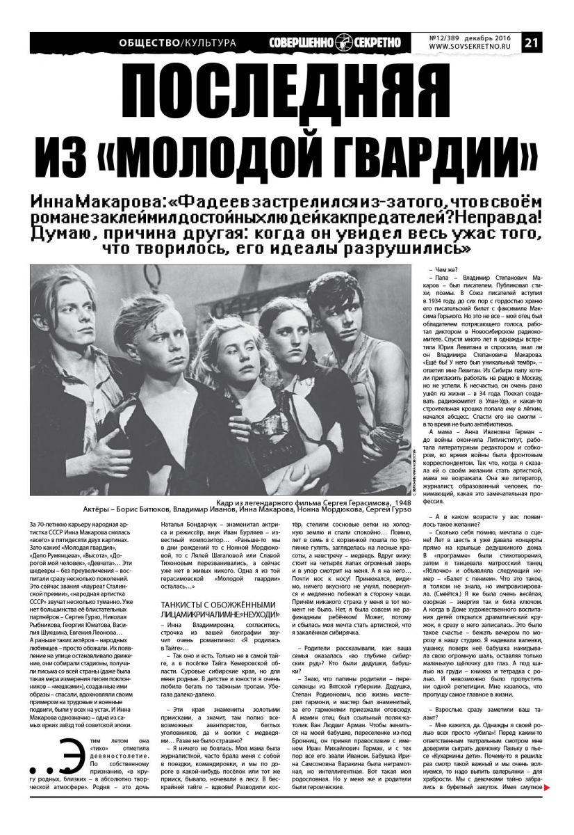 ли молодые ребята, члены какой-то подпольной организации. Поэтому я запоем прочла роман Александра Фадеева «Молодая гвардия», и это было настоящее потрясение. Чтобы вы понимали атмосферу тех лет… Когда мы во ВГИКе читали его вслух, тишина в аудитории стояла просто гробовая. Воздух «не шевелился»!