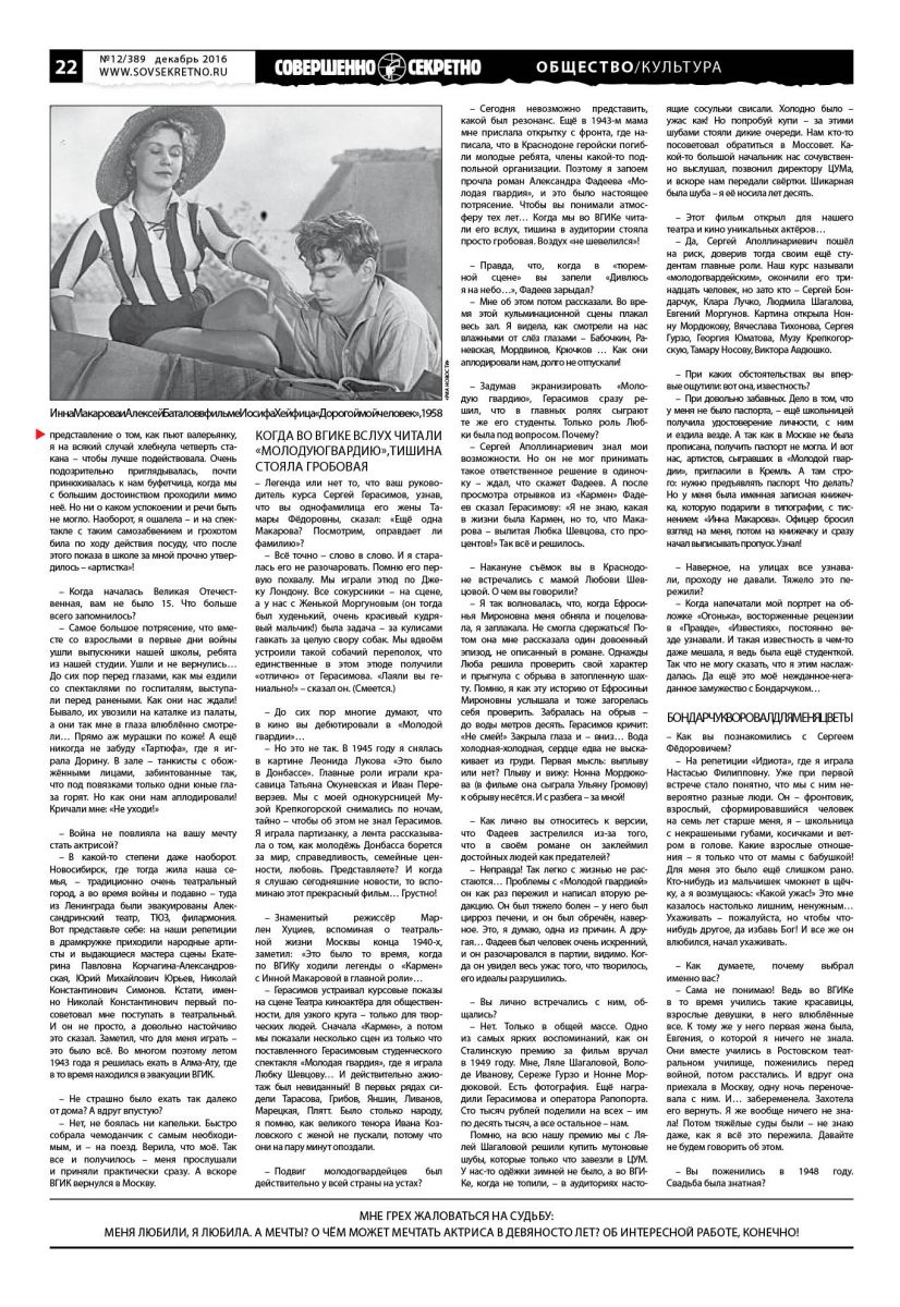 – Сергей Аполлинариевич знал мои возможности. Но он не мог принимать такое ответственное решение в одиночку – ждал, что скажет Фадеев. А после просмотра отрывков из «Кармен» Фадеев сказал Герасимову: «Я не знаю, какая в жизни была Кармен, но то, что Макарова – вылитая Любка Шевцова, сто процентов!» Так всё и решилось.