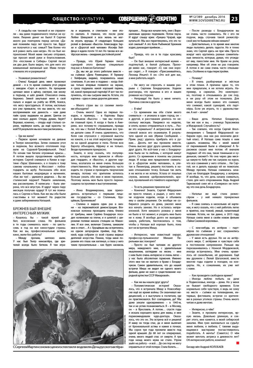 – Знаете, я прожила интересную, яркую жизнь. Довольно длинную, и секрет этого, мне кажется, в моей сибирской закалке. Мне грех жаловаться на судьбу: меня любили, я любила. С такими выдающимися мастерами посчастливилось поработать. А мечты? (Смеется.) О чём может мечтать актриса в девяносто лет? Об интересной работе, конечно!