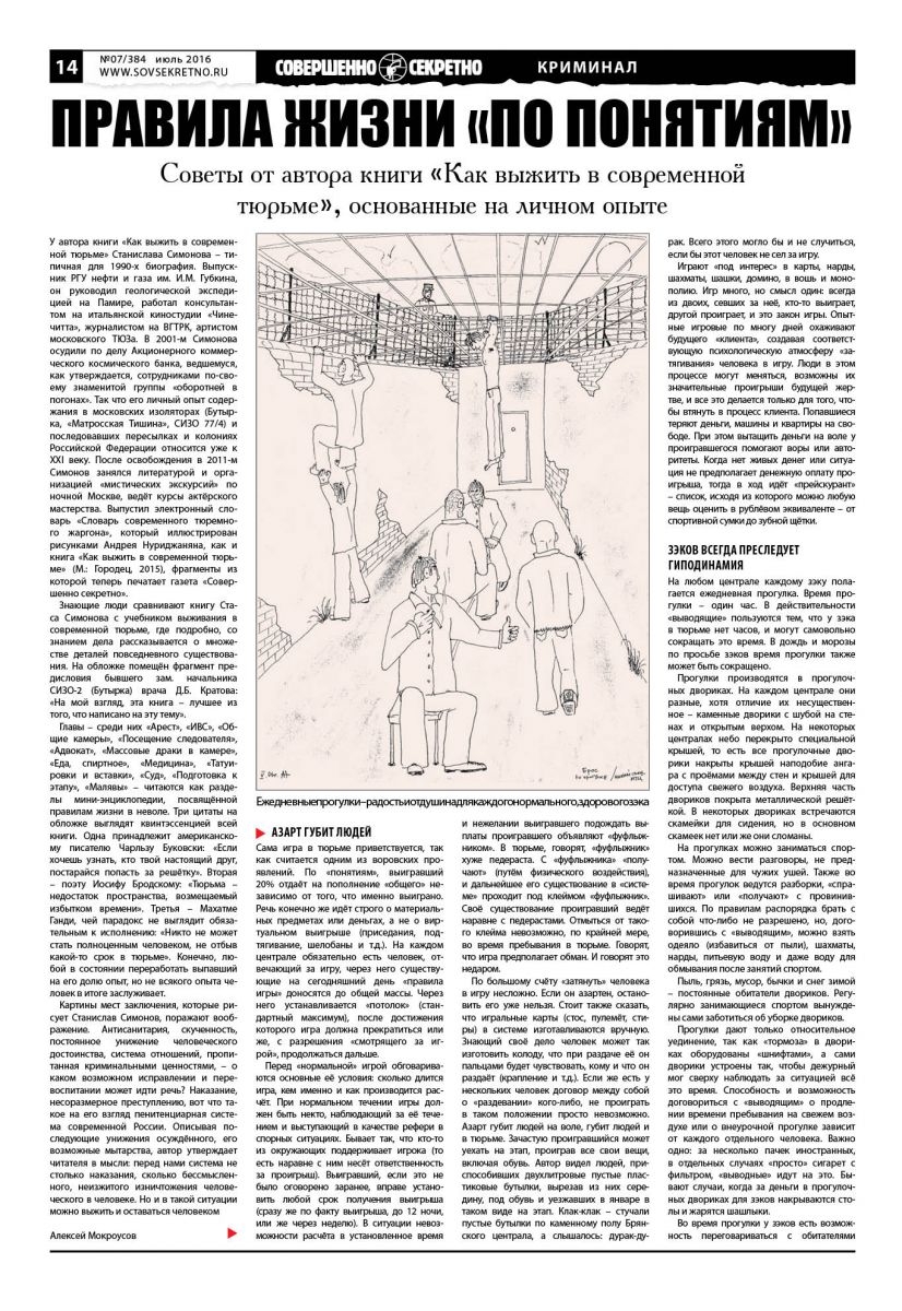 У автора книги «Как выжить в современной тюрьме» Станислава Симонова – типичная для 1990-х биография. Выпускник РГУ нефти и газа им. И.М. Губкина, он руководил геологической экспедицией на Памире, работал консультантом на итальянской киностудии «Чинечитта», журналистом на ВГТРК, артистом московского ТЮЗа. В 2001-м Симонова осудили по делу Акционерного коммерческого космического банка, ведшемуся, как утверждается, сотрудниками по-своему знаменитой группы «оборотней в погонах». Так что его личный опыт содержания в московских изоляторах (Бутырка, «Матросская Тишина», СИЗО 77/4) и последовавших пересылках и колониях Российской Федерации относится уже к XXI веку. После освобождения в 2011-м Симонов занялся литературой и организацией «мистических экскурсий» по ночной Москве, ведёт курсы актёрского мастерства. Выпустил электронный словарь «Словарь современного тюремного жаргона», который иллюстрирован рисунками Андрея Нуриджаняна, как и книга «Как выжить в современной тюрьме» (М.: Городец, 2015), фрагменты из которой теперь печатает газета «Совершенно секретно».