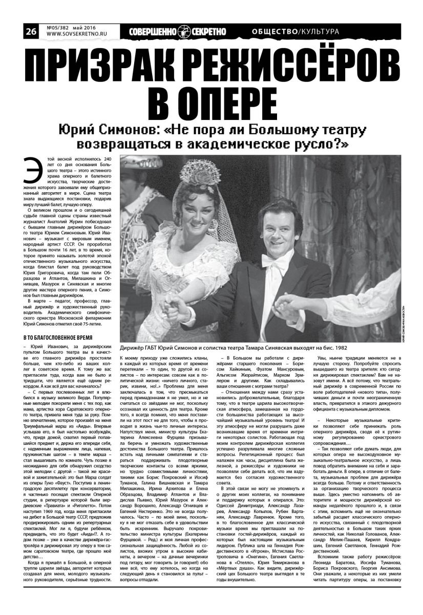 О великом прошлом и о сегодняшней судьбе главной сцены страны известный журналист Анатолий Журин побеседовал с бывшим главным дирижёром Большого театра Юрием Симоновым. Юрий Иванович музыкант с мировым именем, народный артист СССР. Он проработал в Большом почти 16 лет, в то время, которое принято называть золотой эпохой отечественного музыкального искусства, когда блистал балет под руководством Юрия Григоровича, когда там пели Образцова и Атлантов, Милашкина и Огнивцев, Мазурок и Синявская и многие другие мастера оперного пения, а Симонов был главным дирижёром.