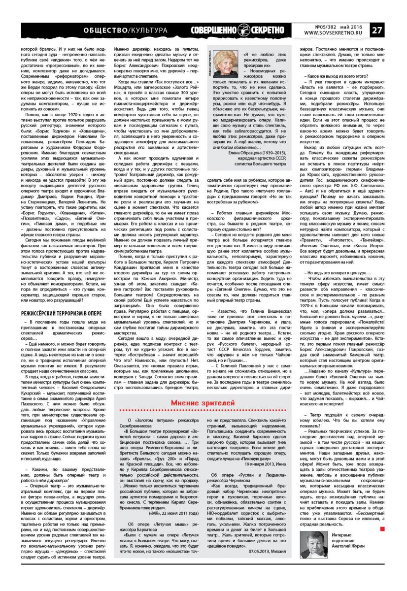 Реальных творческих успехов. За последние десятилетия над оперной музыкой в том числе русской на наших сценах совершено достаточно экспериментов. Наши западные друзья, наконец, могут быть довольны нами и в этой сфере! Может быть, уже пора возвращать в залы отечественных театров уважение, любовь и восхищение публики музыкально-вокальными сокровищами, которыми насыщена классическая оперная музыка. Может быть, не будем ждать, когда возмущённая публика начнёт вставать и покидать залы. Намёки на приближение этого времени в обществе уже улавливаются. Бессмертный полк и выставка Серова не иллюзия, а отрадная реальность.