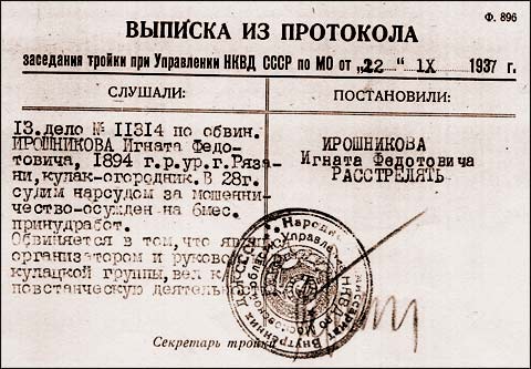 Расстрелы, которые осуществлялись тройками в первой половине 1930-х гг., также были строго секретными. В июле 1937 г. приказ НКВД СССР №00447, положивший начало «массовым операциям», особо предписывал сохранять полную секретность с вынесением и объявлением приговоров троек. В соответствии с директивой НКВД СССР №424, подписанной М.П. Фриновским, осуждённым тройками и двойками приговор не объявлялся – чтобы избежать возможного сопротивления – и о расстреле они узнавали только на месте казни. (Неизвестно, существовала ли подобная директива в практике ЧК, но в первые годы советской власти осуждённых зачастую «ликвидировали», не сообщая им о приговоре.)