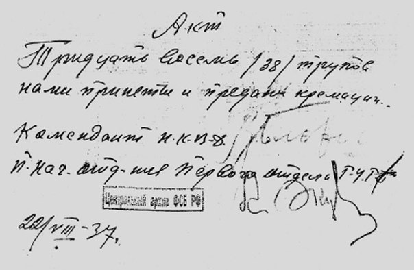 В тридцатые писали так: «убытие по первой категории», «десять лет без права переписки», «спецоперация». Исполнители в объяснениях могли недоговаривать фразу, опуская уточняющее слово – дескать, «я приводил приговор». Характерно, что эсэсовцы также маскировали слово «убийство», употребляя такие эвфемистические выражения, как «особая акция», «чистка», «приведение в исполнение», «исключение», «переселение».