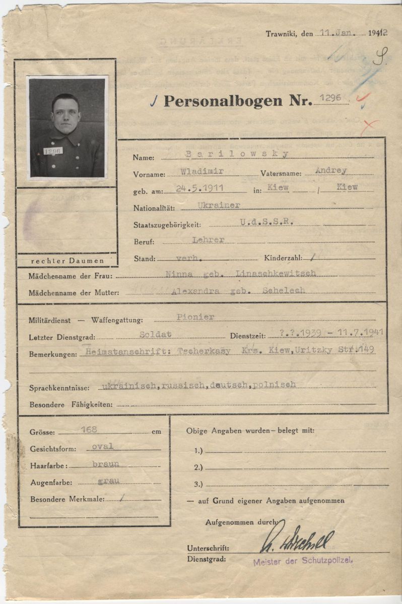АНКЕТА № 1296, ЗАВЕДЕННАЯ НА БЫВШЕГО СОВЕТСКОГО УЧИТЕЛЯ ВЛАДИМИРА АНДРЕЕВИЧА БАРИЛОВСКОГО. УЧЕБНЫЙ ЛАГЕРЬ СС ТРАВНИКИ, 11 ЯНВАРЯ 1942 ГОДА. ПУБЛИКУЕТСЯ ВПЕРВЫЕ