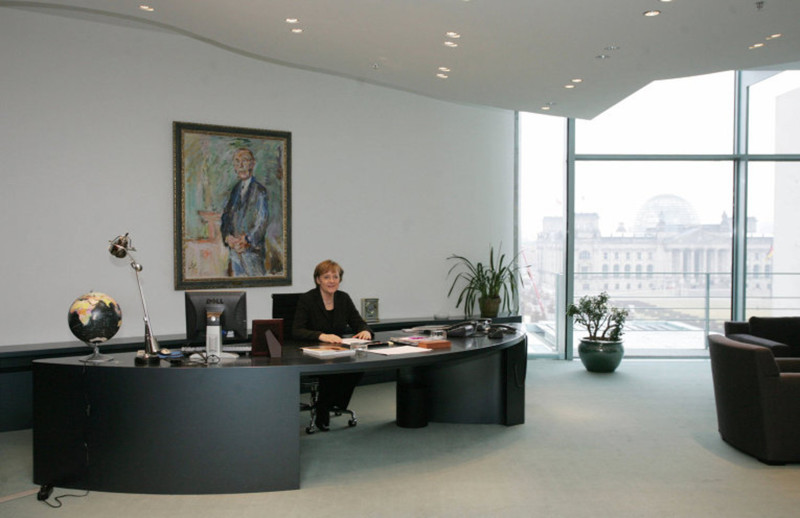 Рабочий кабинет Ангелы Меркель необычайно скромен — недорогой стол, на котором стоят монитор, телефон, лампа, визитница и глобус.