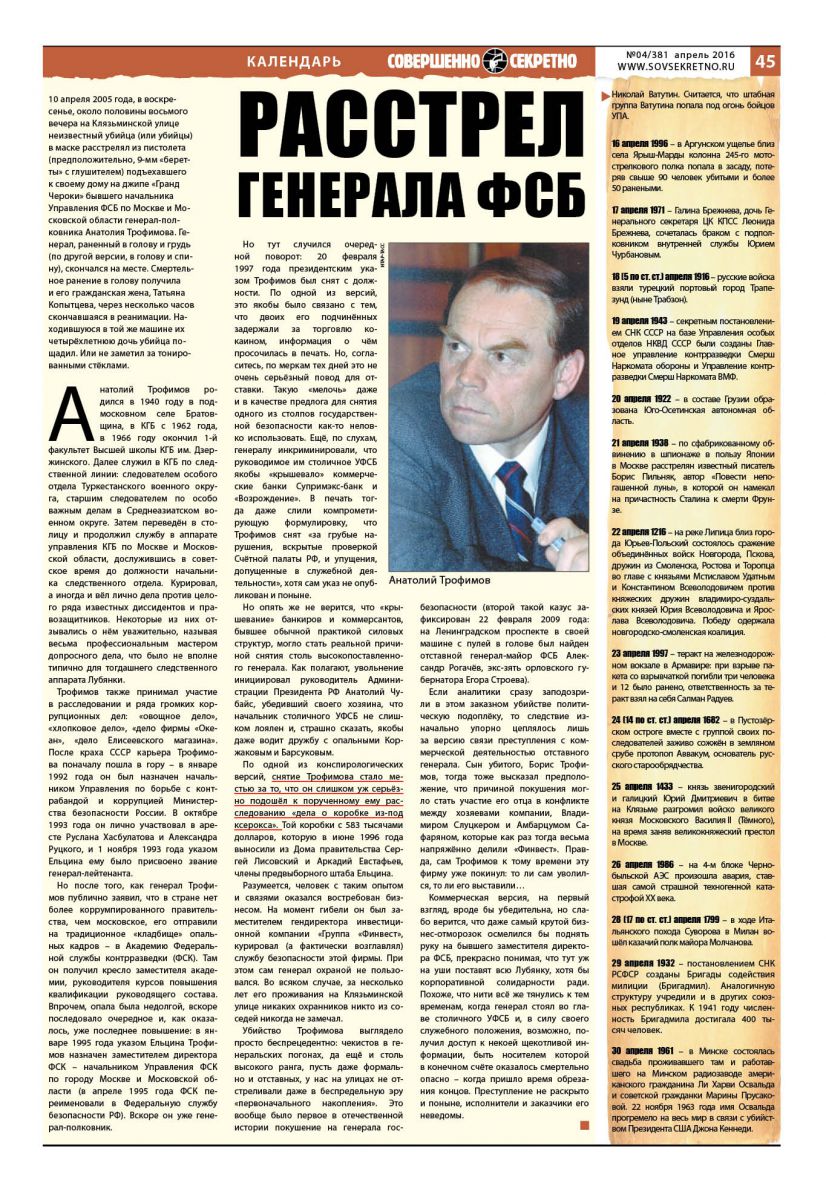 10апреля 2005года, ввоскресенье, около половины восьмого вечера наКлязьминской улице неизвестный убийца (или убийцы) вмаске расстрелял изпистолета (предположительно, 9-мм беретты сглушителем) подъехавшего ксвоему дому наджипе Гранд Чероки бывшего начальника Управления ФСБ поМоскве иМосковской области генерал-полковника Анатолия Трофимова. Генерал, раненный вголову игрудь (подругой версии, вголову испину), скончался наместе. Смертельное ранение вголову получила иего гражданская жена, Татьяна Копытцева, через несколько часов скончавшаяся вреанимации. Находившуюся втойже машине их четырёхлетнюю дочь убийца пощадил. Или незаметил затонированными стёклами.