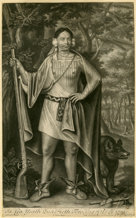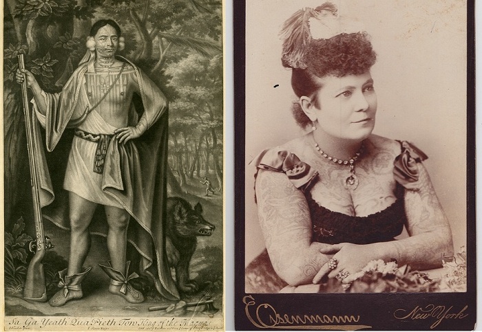 Одним из самых занимательных и старинных экспонатов на выставке является гравюра с изображением вождя племени могавков. Его лицо и тело покрыты татуировками. Для некоторых индейских племен нательная живопись была методом отображения военных побед. Тату также наносились в ритуальных целях, например, для исцеления того или иного недуга.