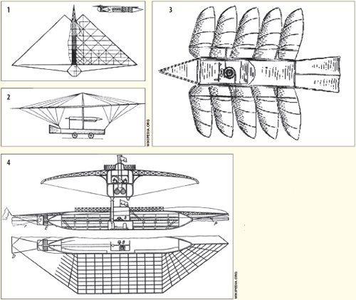 Изобретения Николая Телешова: 1. Чертёж из патента «Усовершенствованная система воздухоплавания»; 2. Проект самолёта «Аэронав»; 3. Махолёт Телешова –Меннона – Струве; 4. Проект «Система воздухоплавания»